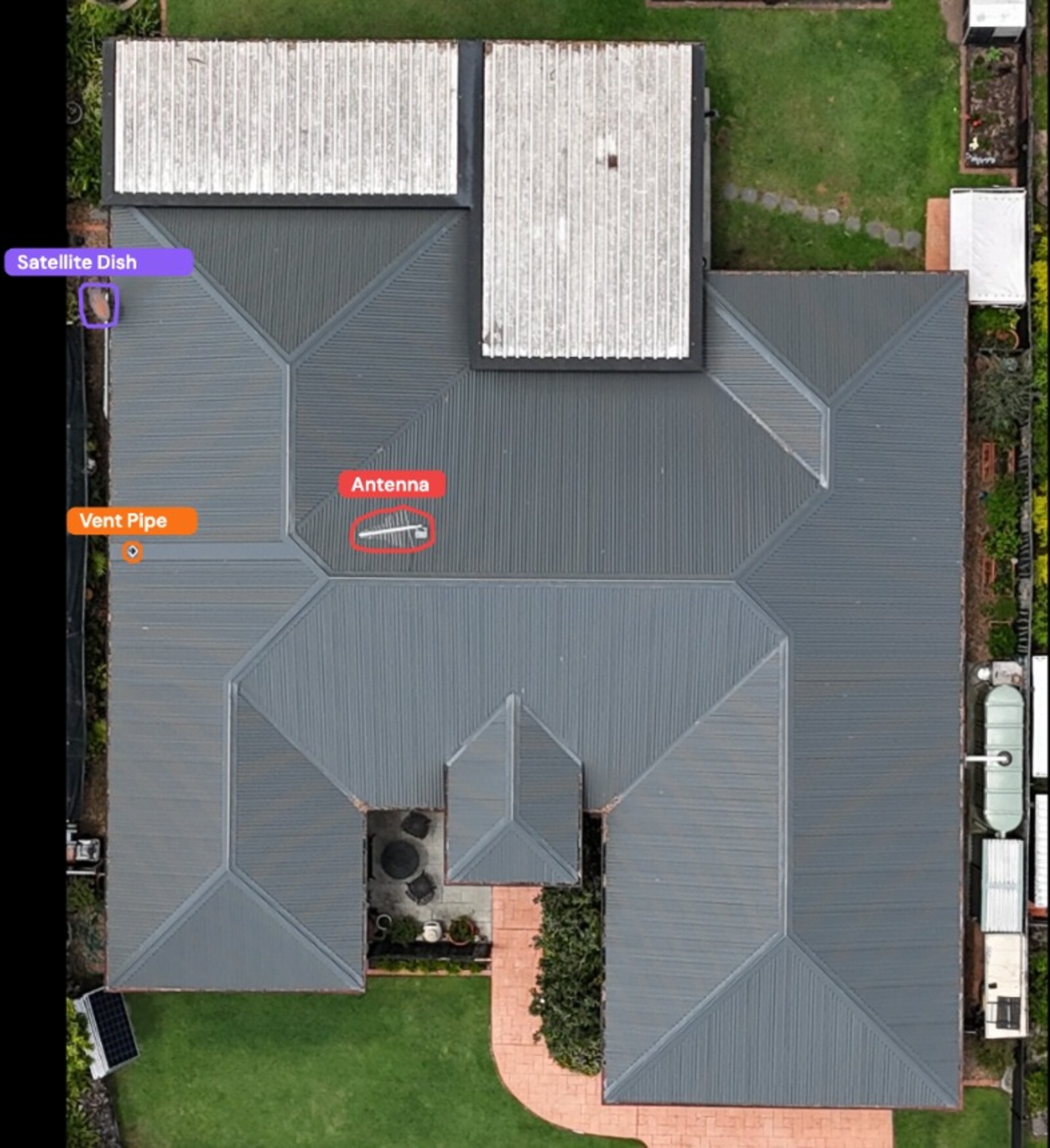 ARIS identifies and counts roof accessories — satellite dishes, vent pipes, antennas, skylights — automatically flagging each fixture for compliance documentation and cost estimation. No feature goes unrecorded.