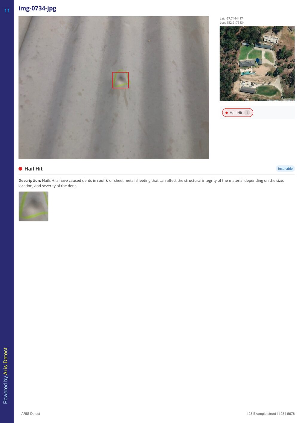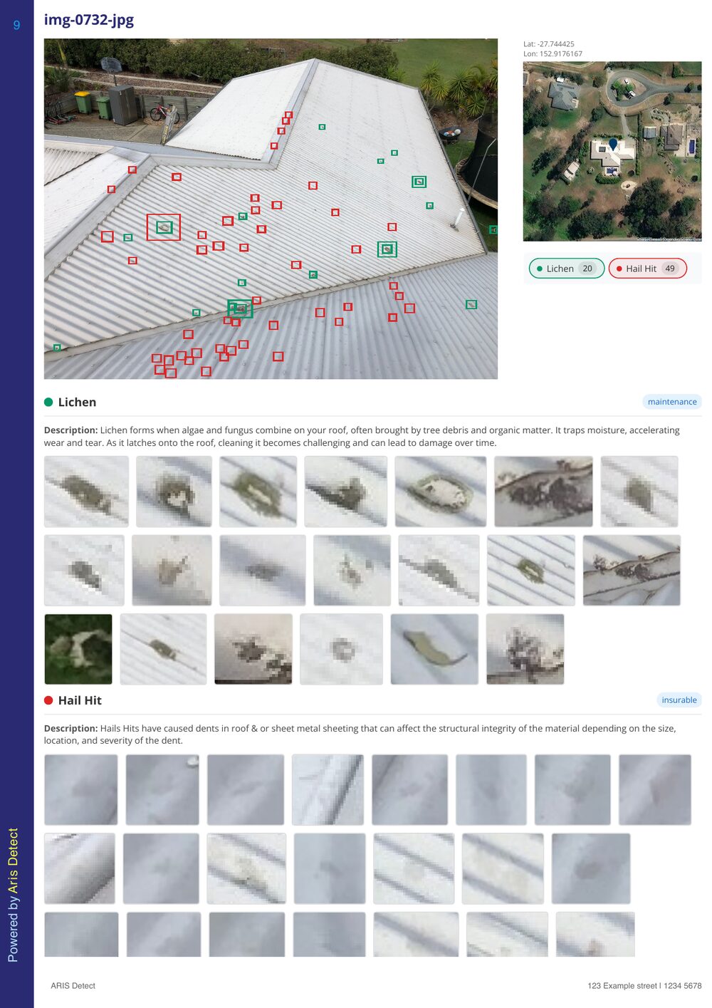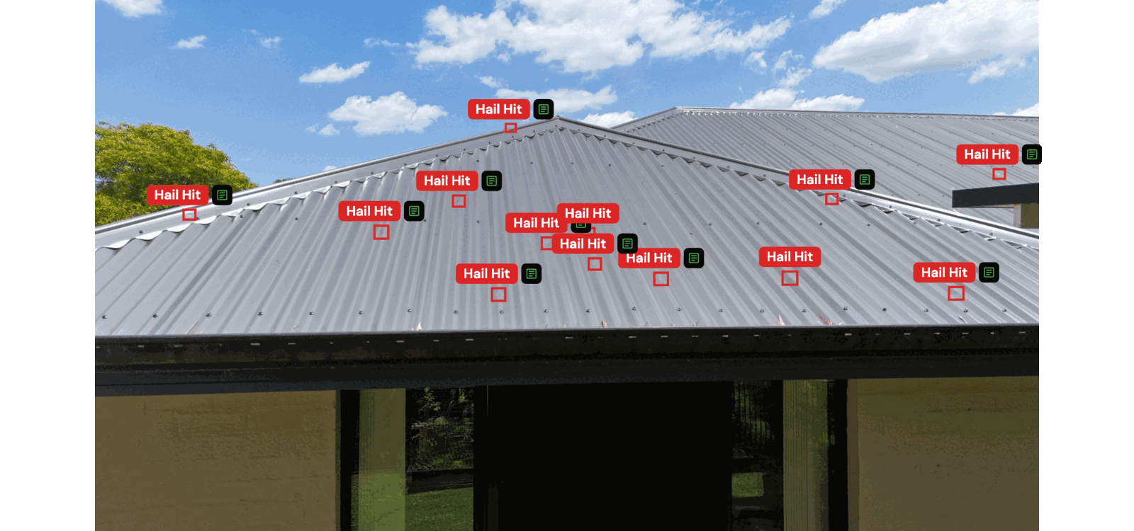 The detection engine analyses every image for hail strikes, cracked tiles, missing materials, impact damage, and more. Assessors review and confirm findings before finalisation.