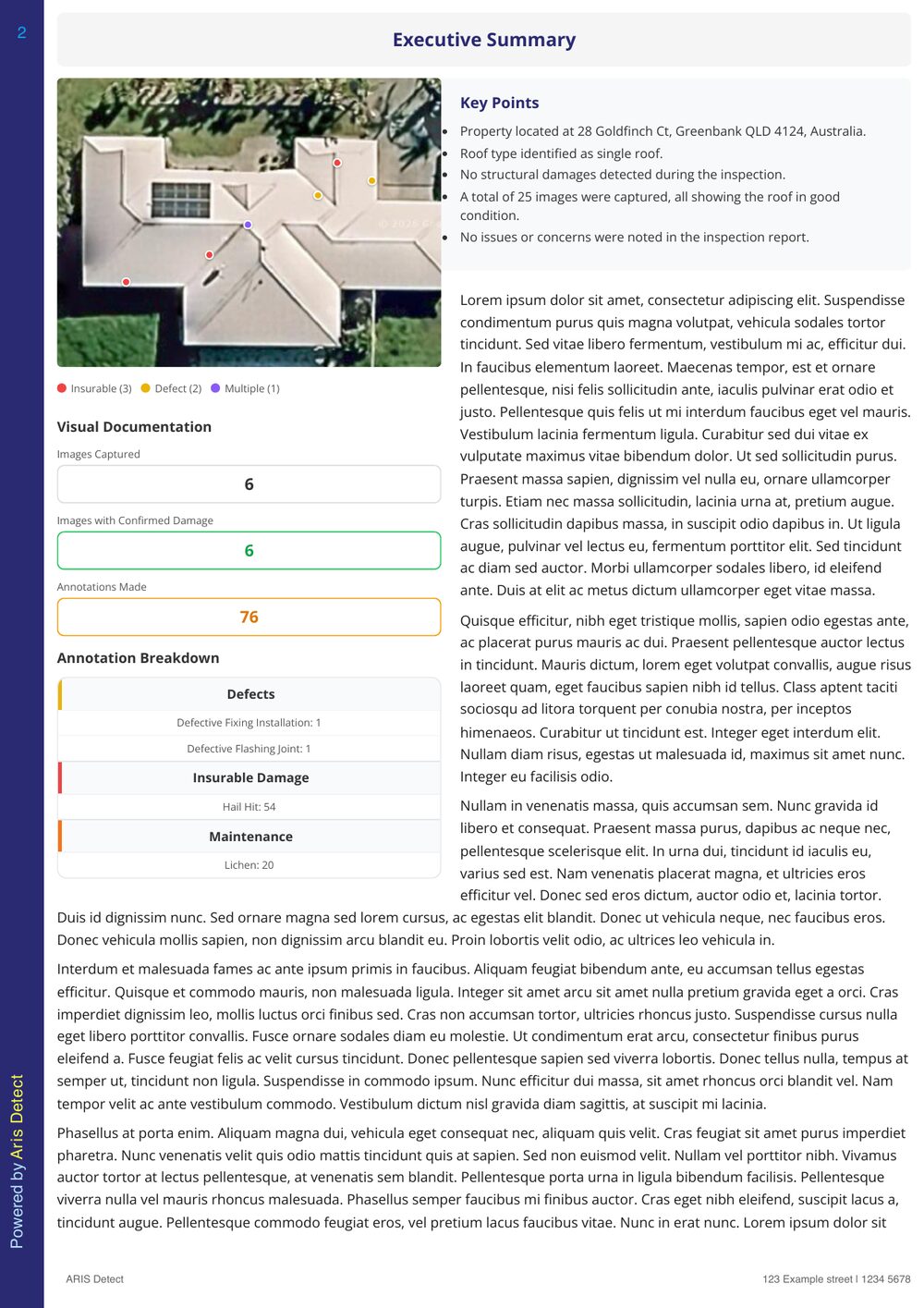 One click. ARIS compiles assessor notes, annotated imagery, measurements, and recommendations into a branded, compliance-ready PDF.